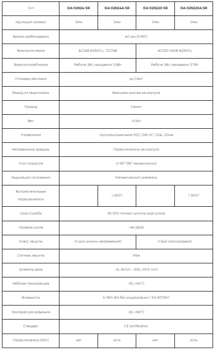 Линейка электроприводов включает в себя модели с крутящим моментом от 2Nm до 24Nm. Электродвигатель Mabuchi motor, используемый так же в электроприводах Belimo, обеспечивает надежность срабатывания.