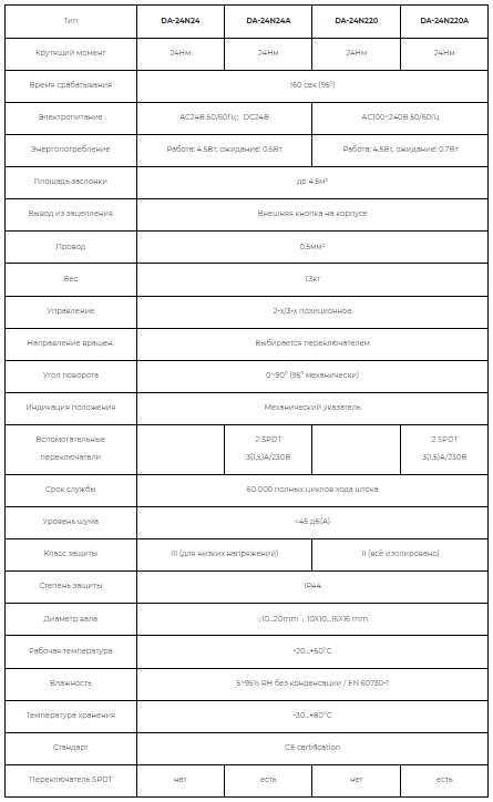 Линейка электроприводов включает в себя модели с крутящим моментом от 2Nm до 24Nm. Электродвигатель Mabuchi motor, используемый так же в электроприводах Belimo, обеспечивает надежность срабатывания.