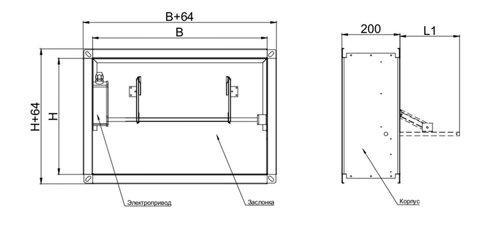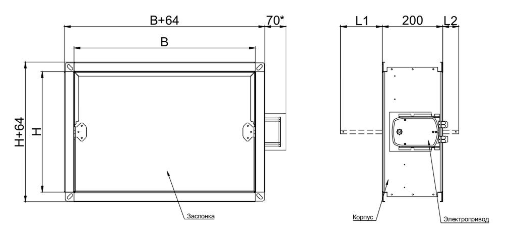 Клапан состоит из корпуса, изготовленного из оцинкованной стали и электропривода привода, расположенного снаружи или внутри корпуса. Корпус имеет длину 200 мм и конструктивно аналогичен отрезку воздуховода, такой же длины, с универсальными монолитными фланцами шириной 30 мм. Клапаны не подлежат установке в помещениях категорий А и Б по взрывопожароопасности. Окружающая среда не должна содержать агрессивных паров и газов в концентрациях, разрушающих металлы, лакокрасочные покрытия и электроизоляцию.