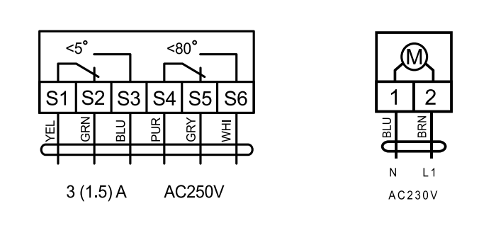 Сигнализация положений Электропривод содержит встроенный переключатель для сигнализации положения створки при углах поворота на 5° или 85°. Промежуточное положение определяется по механическому указателю.