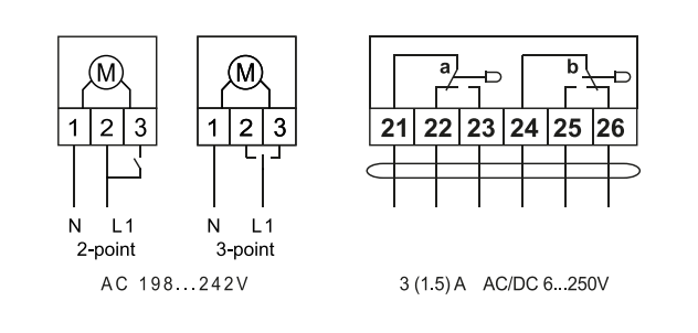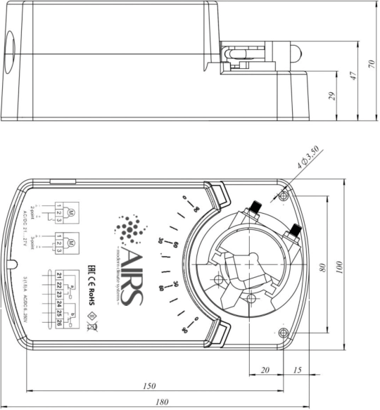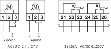 Электропривод содержит один встроенный микропереключатель для контроля крайних положений. Контролируемый угол положения 5° или 85° выбирается поворотом переключателя на верхней крышке привода. Промежуточное положение определяется по механическому указателю.